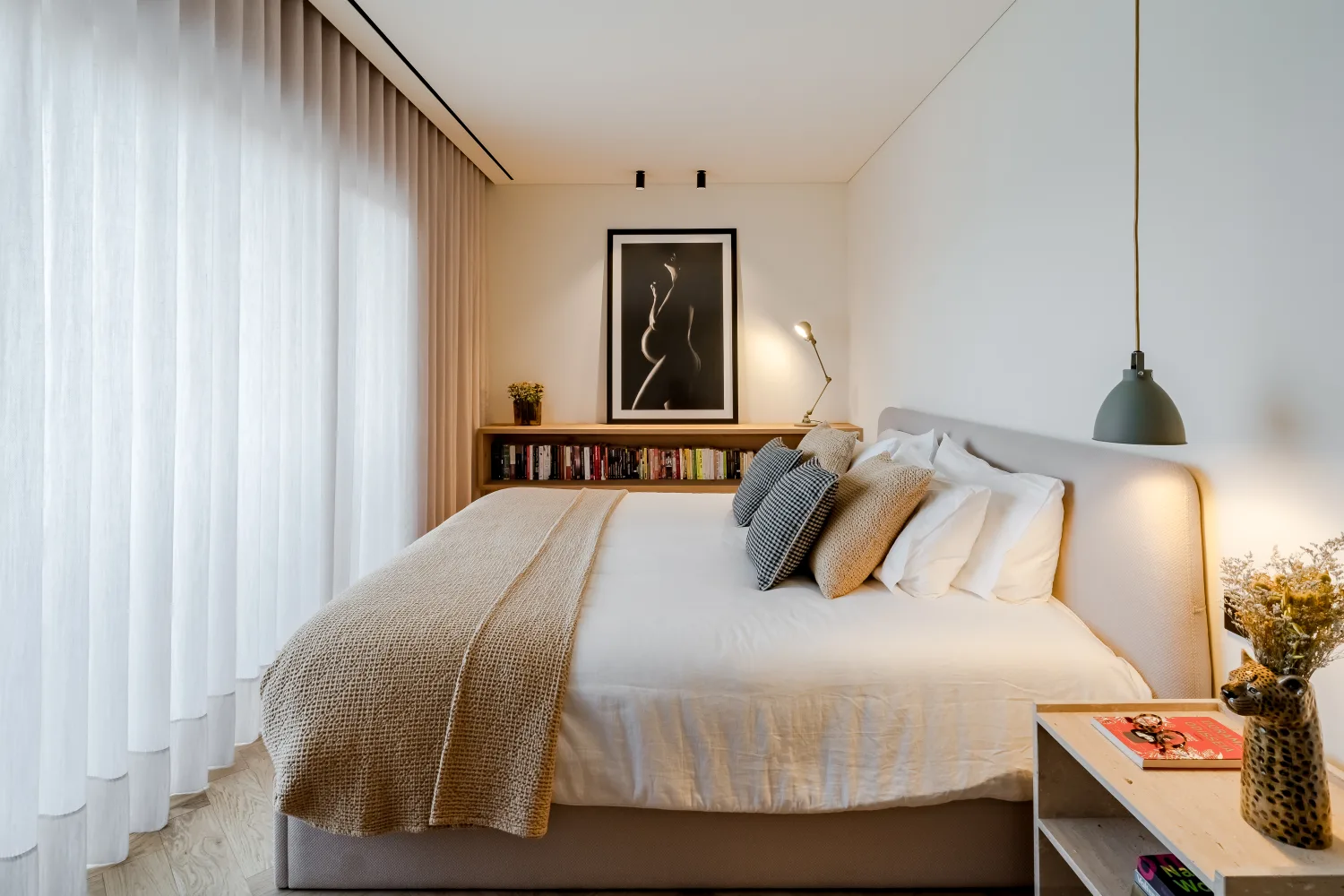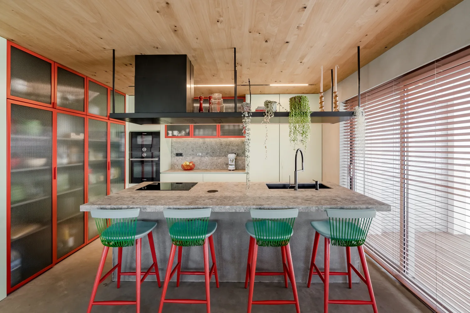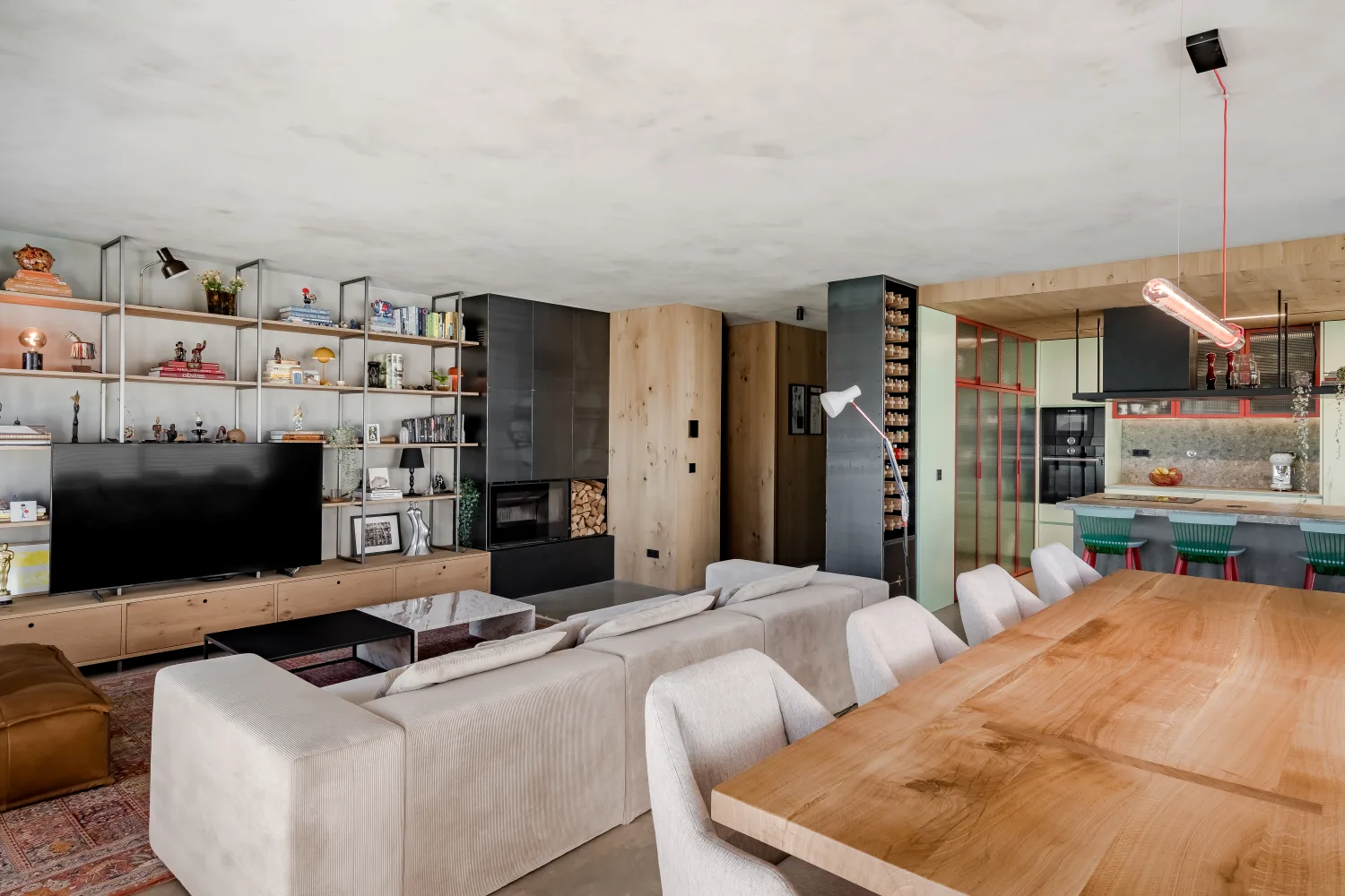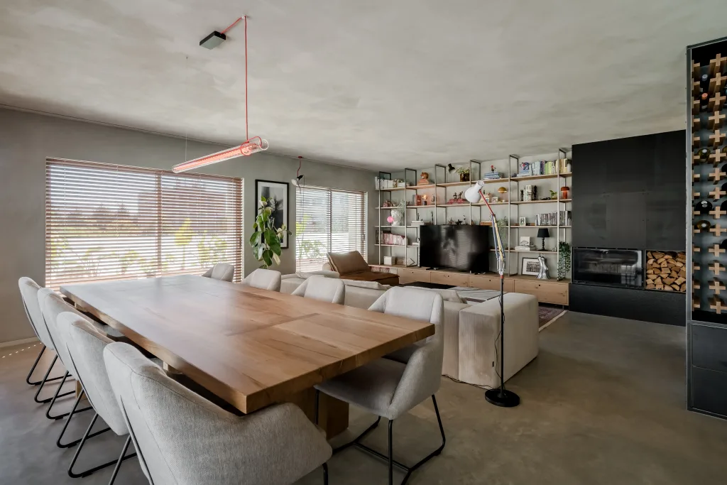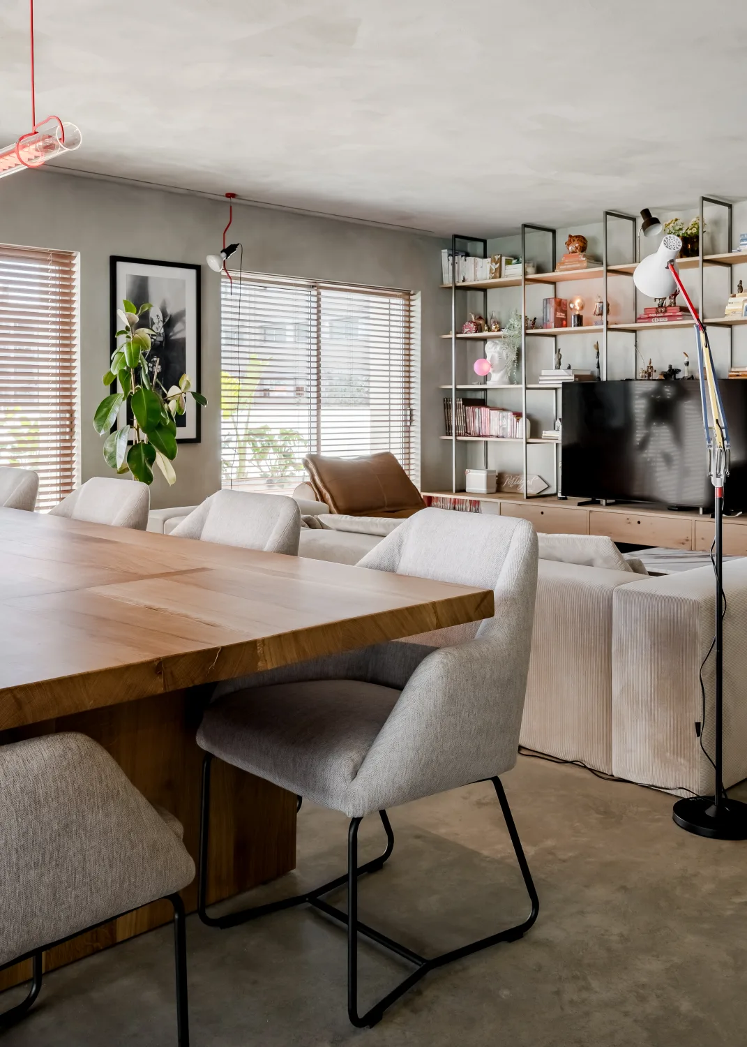 Nesse sentido, optou-se por conjugar alguns elementos brutos, tais como o betão afagado, o microcimento, a chapa metálica crua e a madeira de carvalho rústico. Estes materiais têm um maior destaque na zona da entrada e zona social.