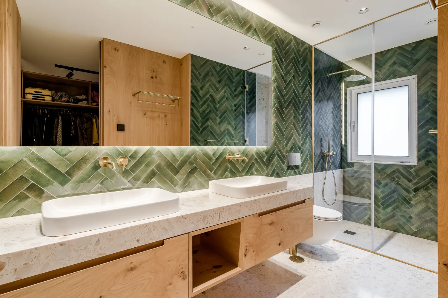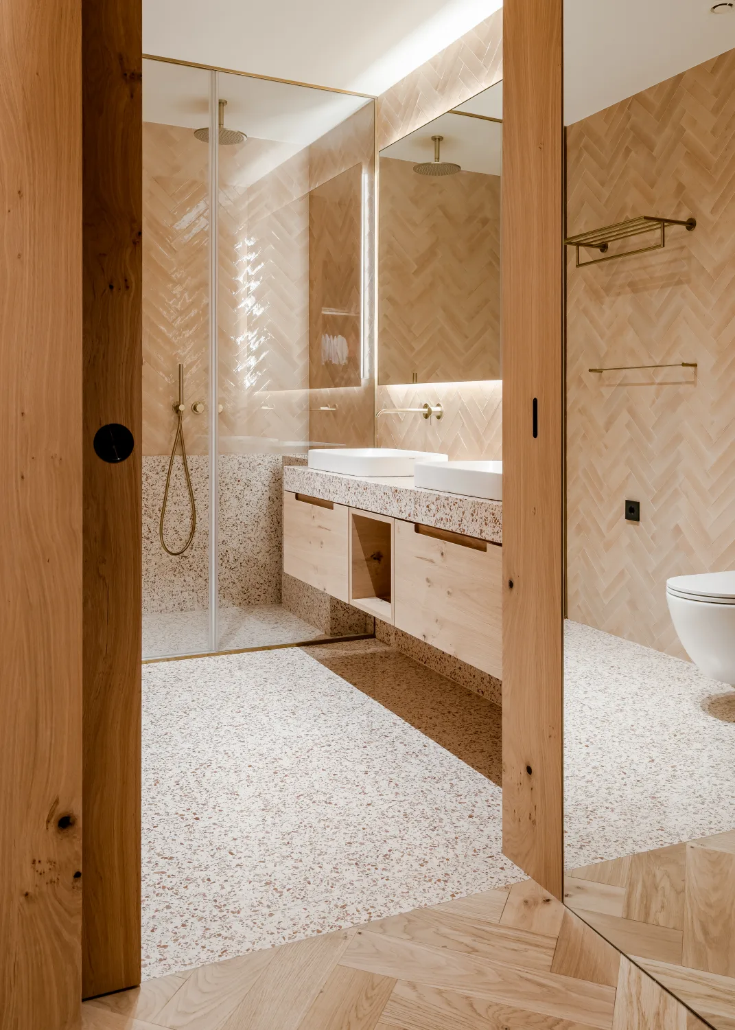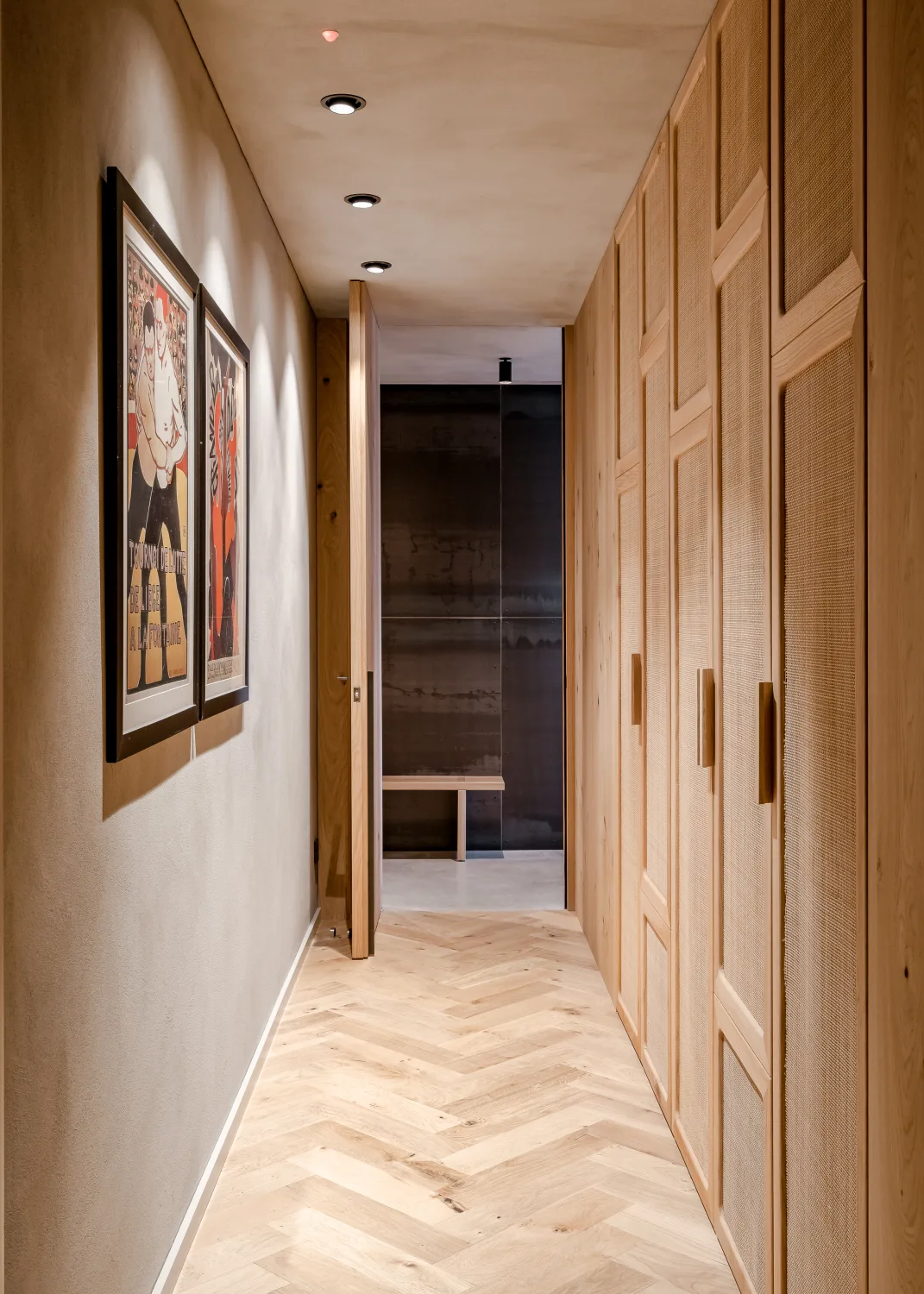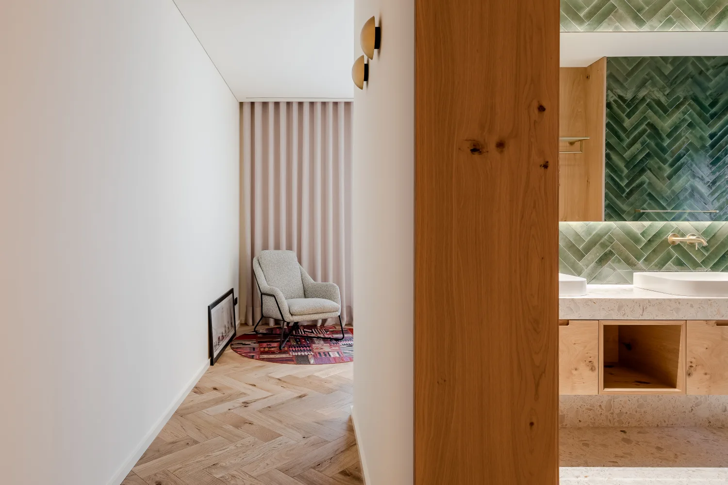 Na zona mais privada, optou-se por combinar a madeira de carvalho rústico nos pavimentos com cores nos revestimentos de paredes para tornar o ambiente mais acolhedor e divertido, especialmente no interior dos quartos das filhas e no quarto de hóspedes, que funciona também como quarto de brincar. A colocação do pavimento em espinha em contraste com a cor e a textura das paredes, confere ao ambiente uma sensação de ritmo. O mesmo acontece nas casas de banho – no entanto, esse a sensação surge pela conjugação de cerâmicos de pequeno formato com lambrins em terrazzo de pedra natural.