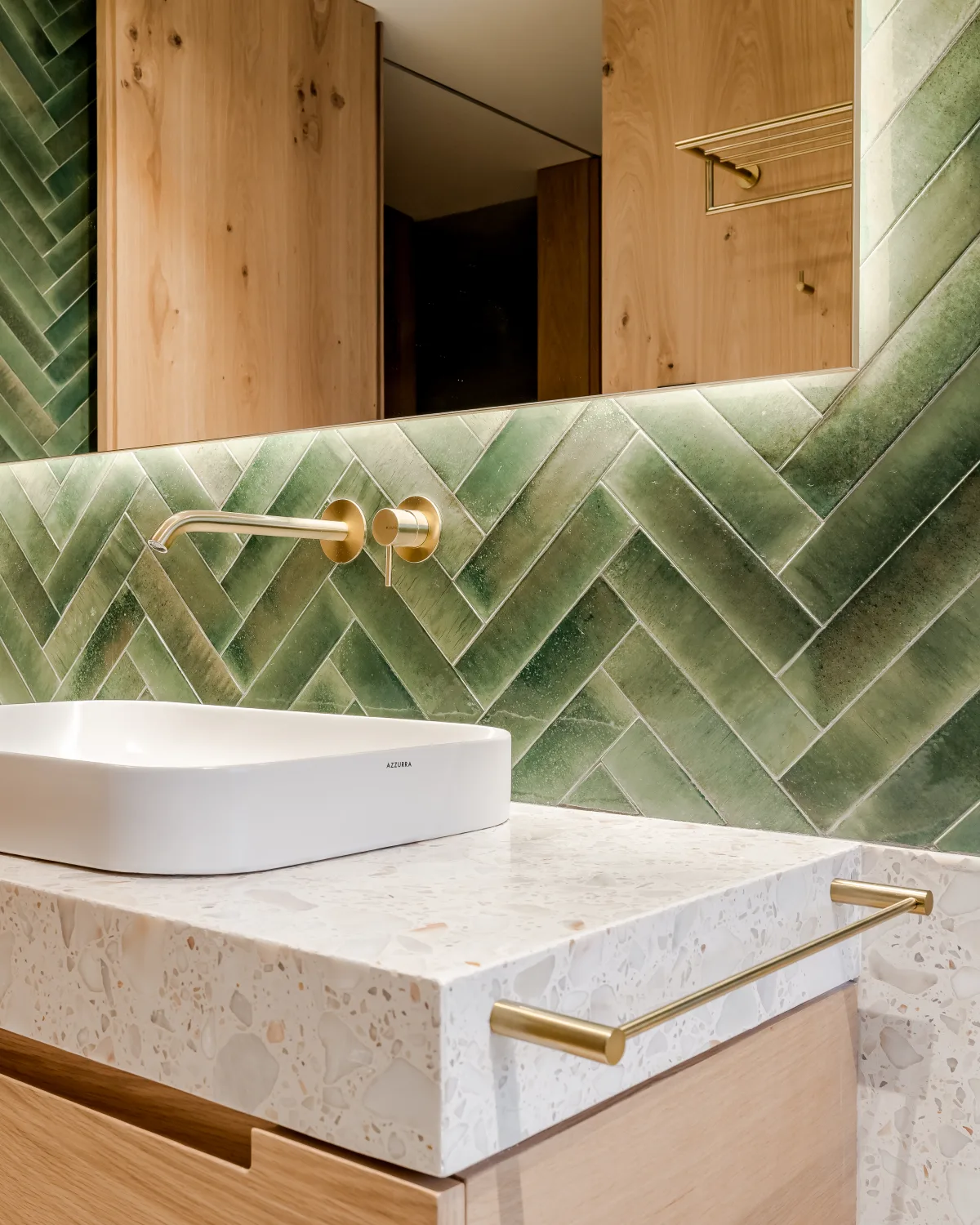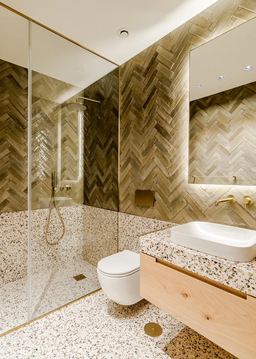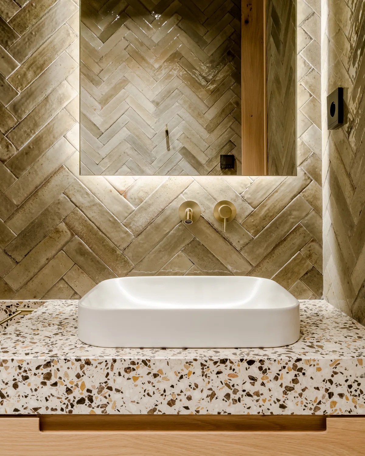 Na zona mais privada, optou-se por combinar a madeira de carvalho rústico nos pavimentos com cores nos revestimentos de paredes para tornar o ambiente mais acolhedor e divertido, especialmente no interior dos quartos das filhas e no quarto de hóspedes, que funciona também como quarto de brincar. A colocação do pavimento em espinha em contraste com a cor e a textura das paredes, confere ao ambiente uma sensação de ritmo. O mesmo acontece nas casas de banho – no entanto, esse a sensação surge pela conjugação de cerâmicos de pequeno formato com lambrins em terrazzo de pedra natural.