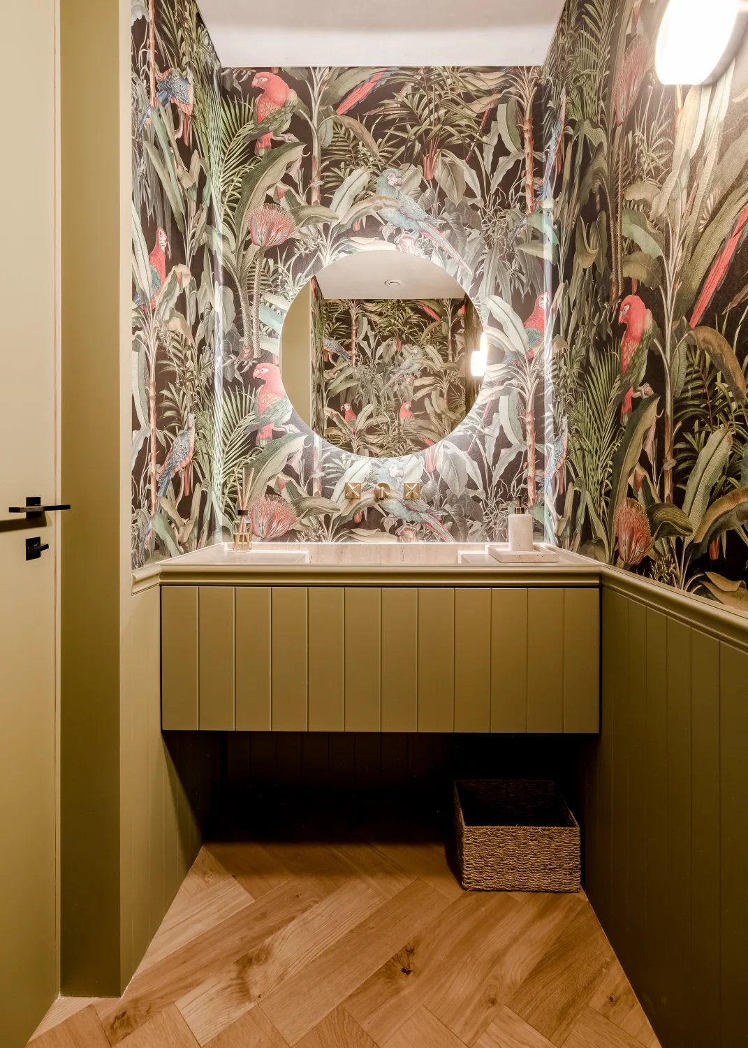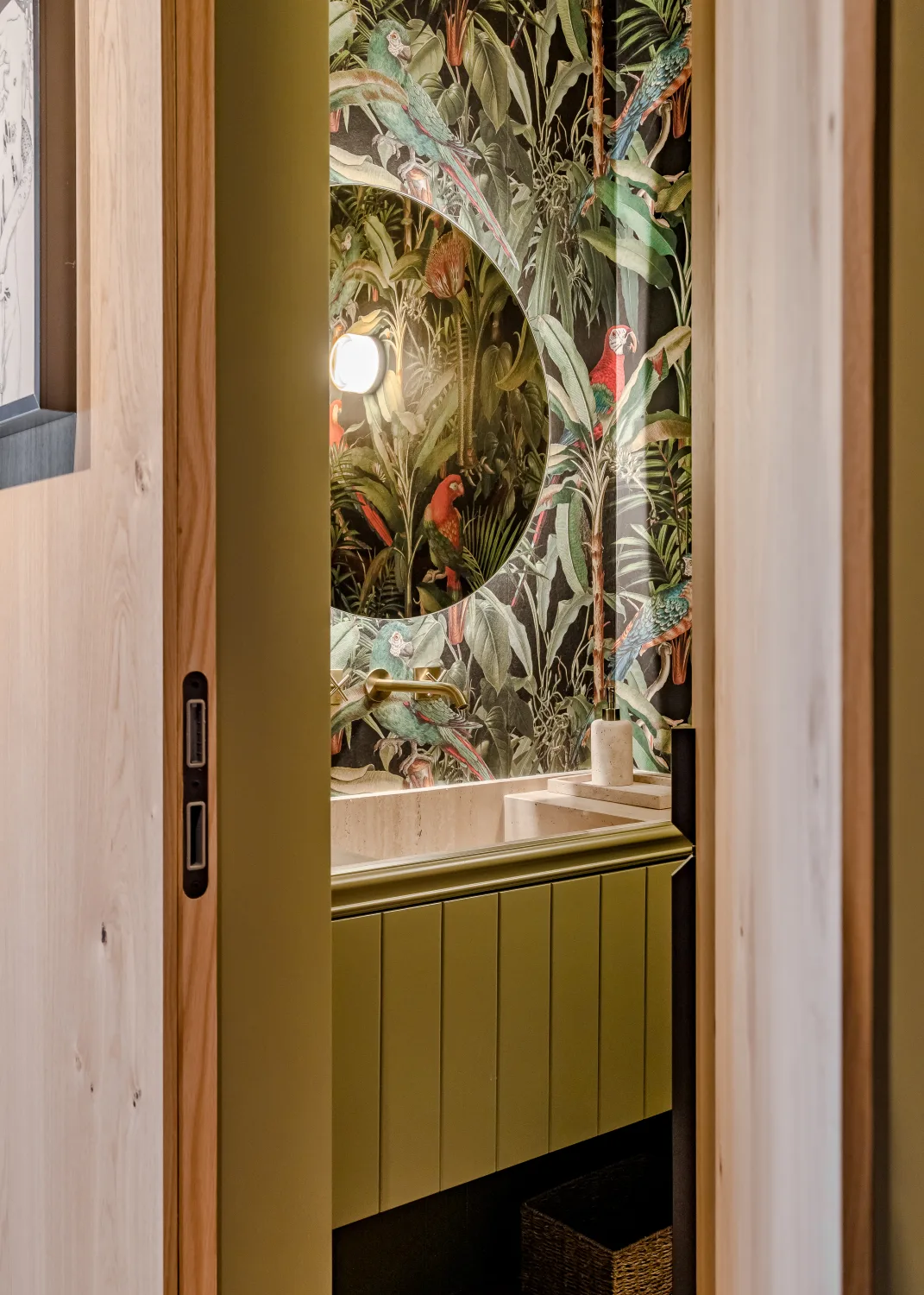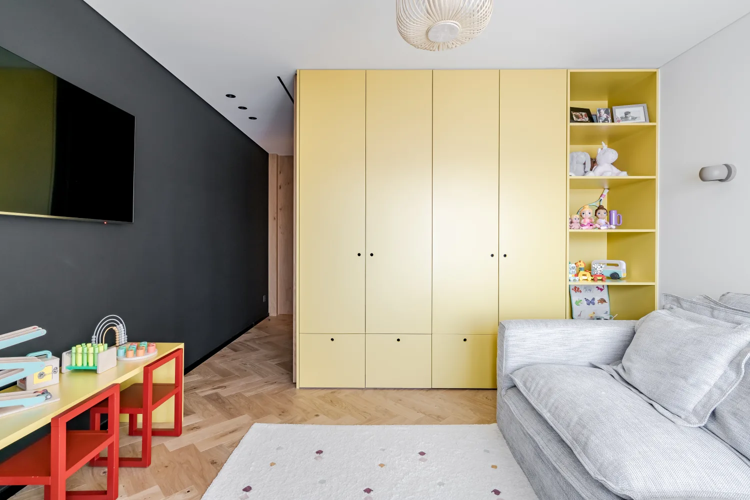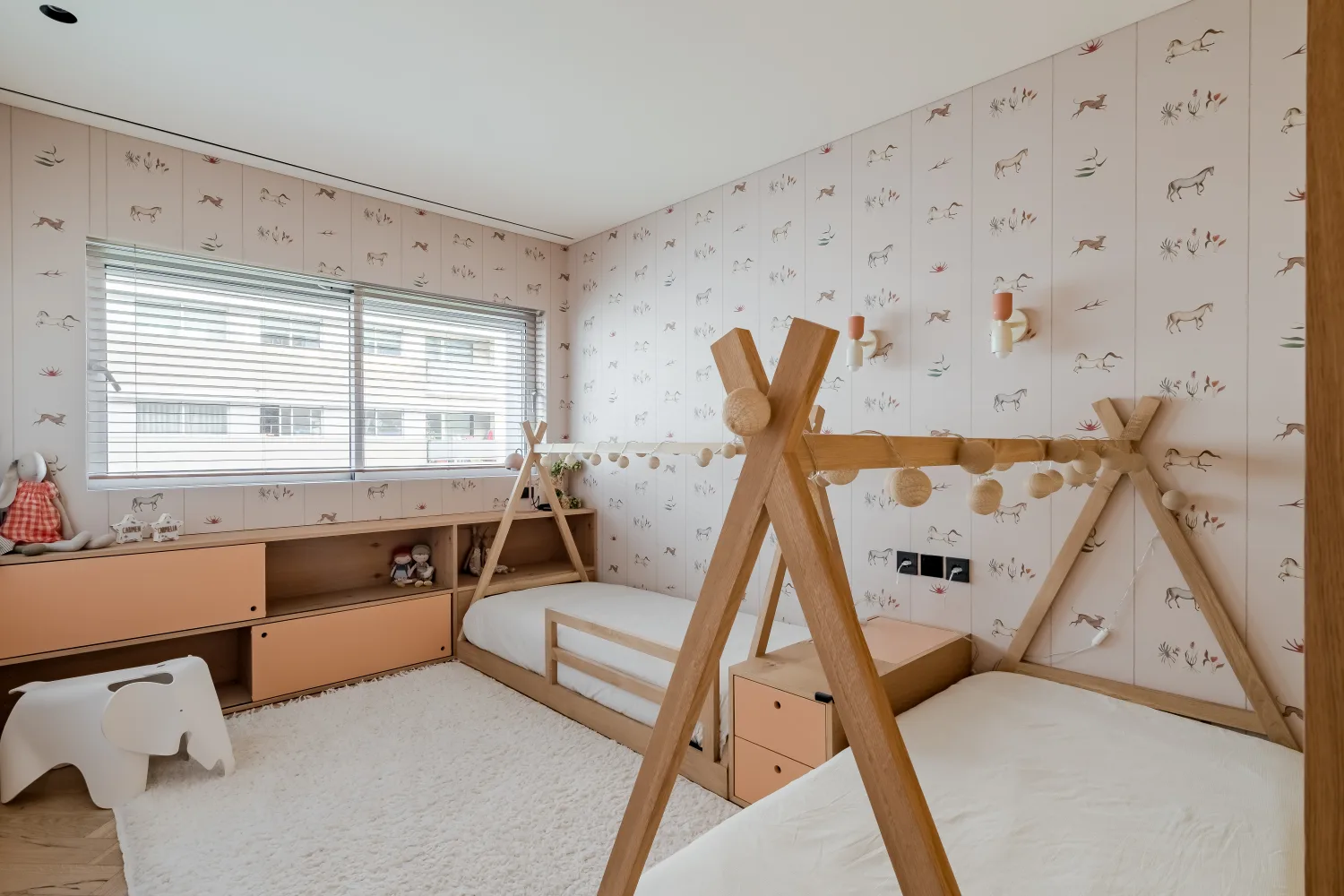 Na zona mais privada, optou-se por combinar a madeira de carvalho rústico nos pavimentos com cores nos revestimentos de paredes para tornar o ambiente mais acolhedor e divertido, especialmente no interior dos quartos das filhas e no quarto de hóspedes, que funciona também como quarto de brincar. A colocação do pavimento em espinha em contraste com a cor e a textura das paredes, confere ao ambiente uma sensação de ritmo. O mesmo acontece nas casas de banho – no entanto, esse a sensação surge pela conjugação de cerâmicos de pequeno formato com lambrins em terrazzo de pedra natural.