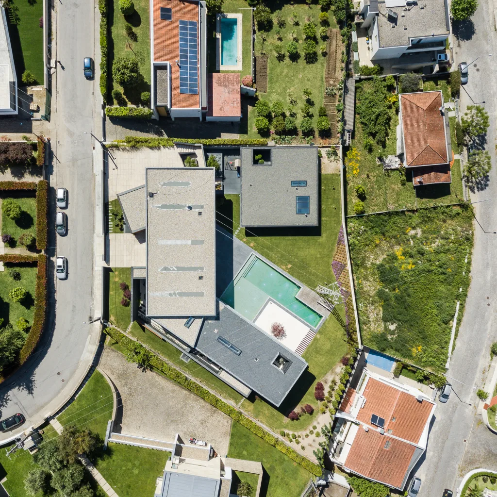 O projeto para a Casa Fraião tinha como principal objetivo beneficiar das vistas privilegiadas sem perder a privacidade. Deste modo, a habitação desenvolve-se em dois pisos, com um corpo central para acolher a área social, e dois corpos laterais em forma de “V” para as funções mais privadas, abrindo a casa à imagem da cidade.