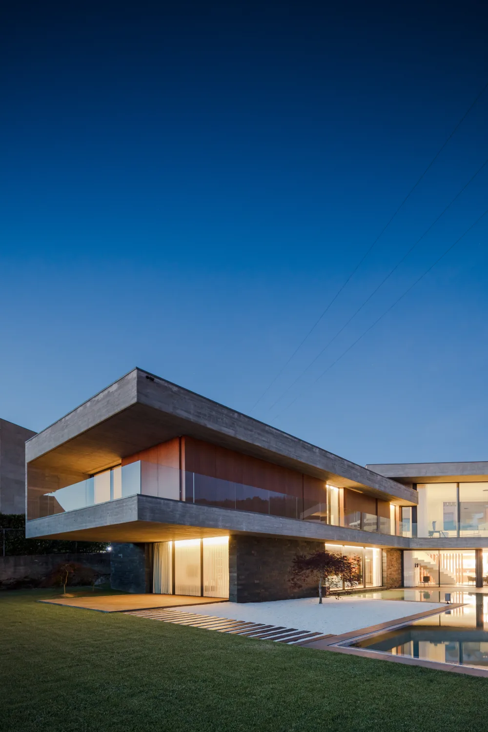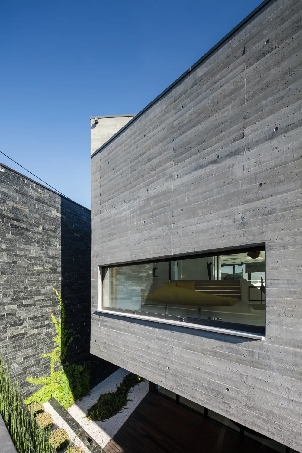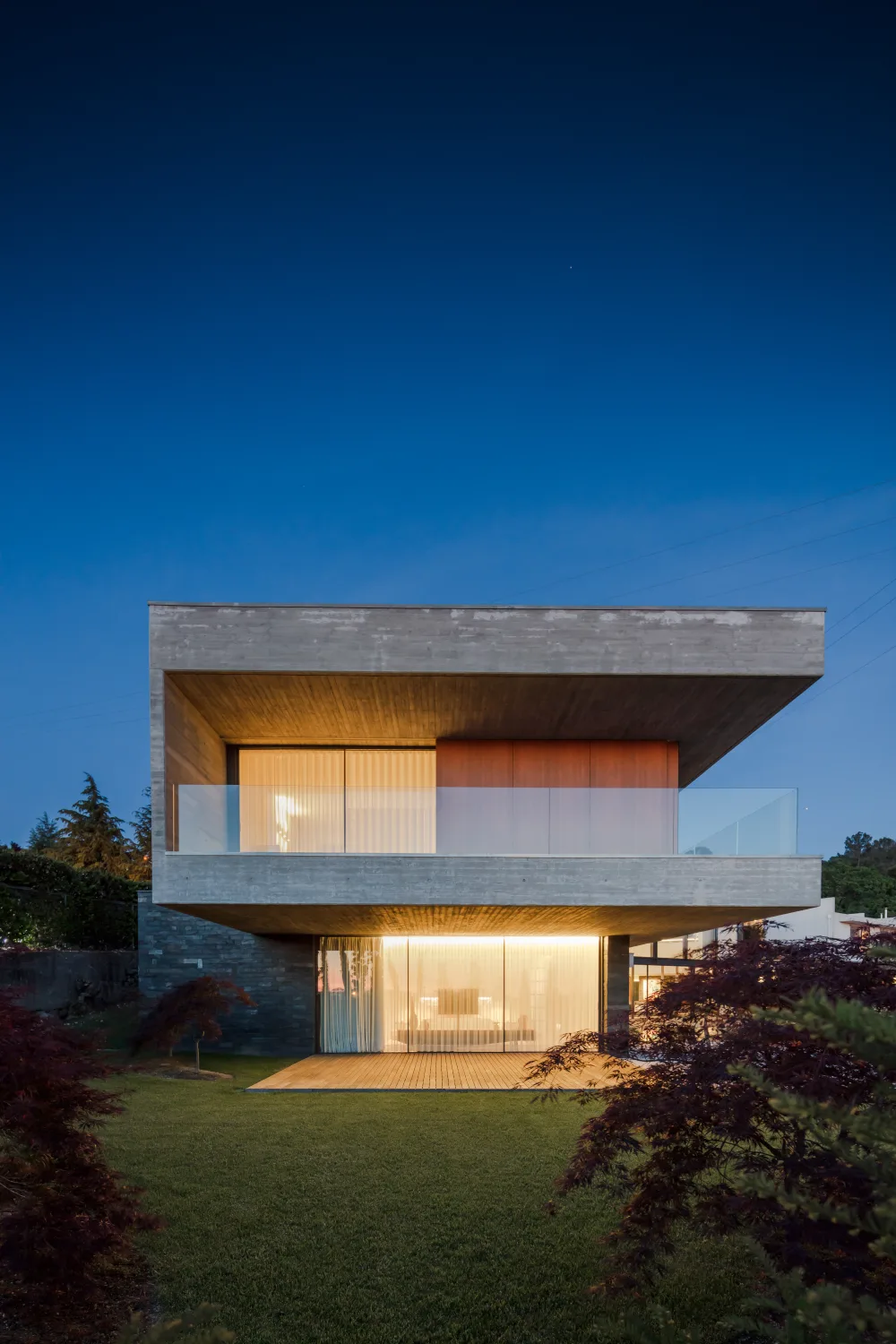 Os materiais foram escolhidos tendo em consideração a baixa manutenção e elevada durabilidade. A base volumétrica é o betão aparente, cofrado com ripas horizontais de madeira, em contraste com os tons de madeira, usada como negativo do volume bruto de betão.