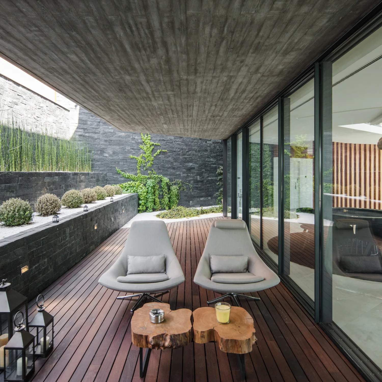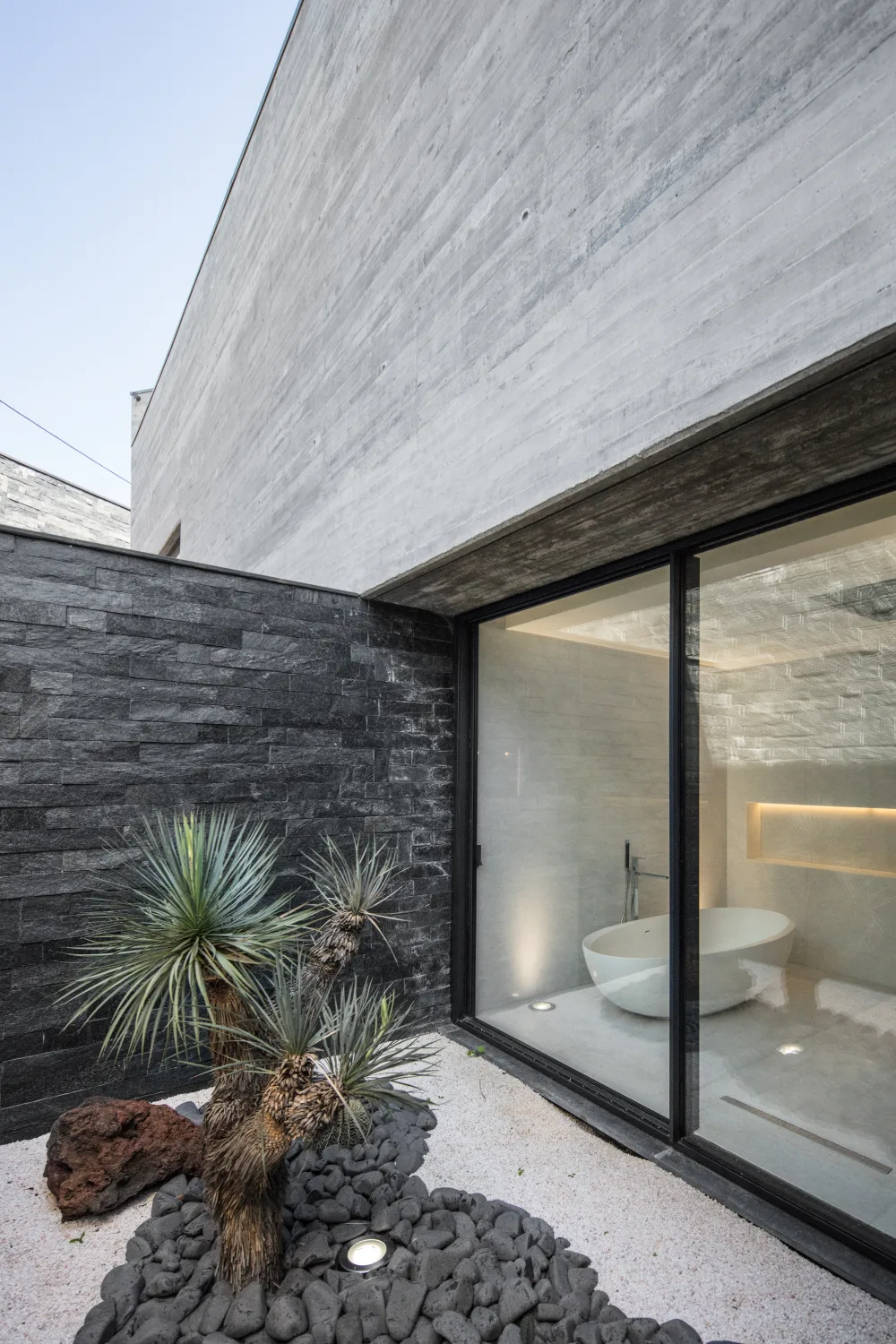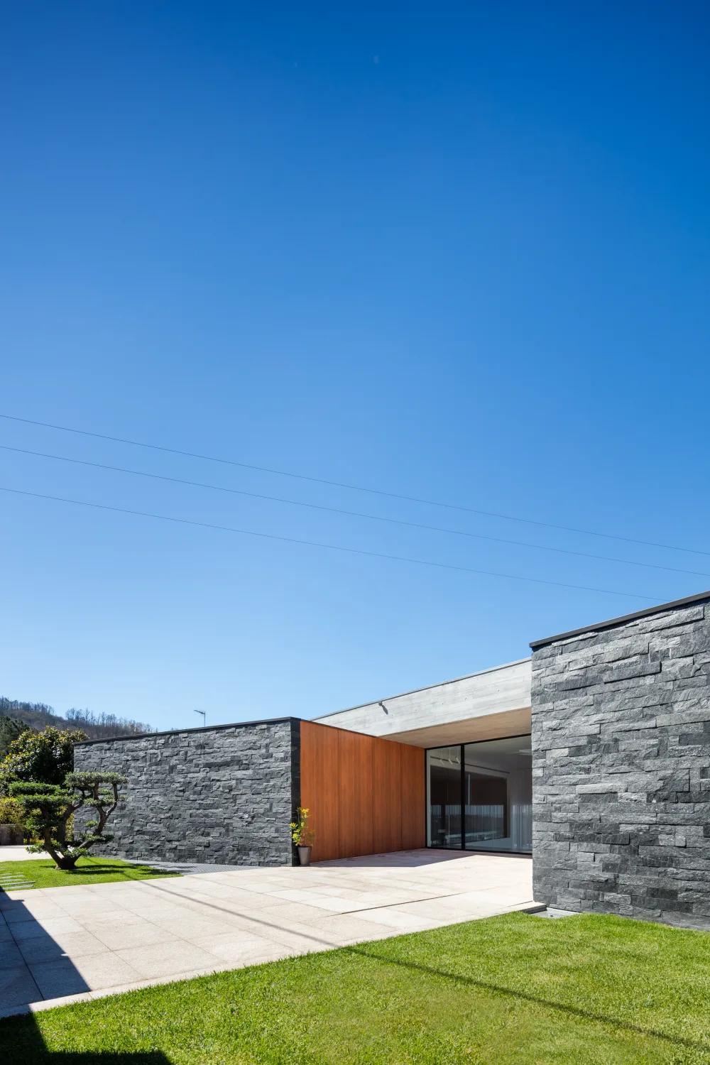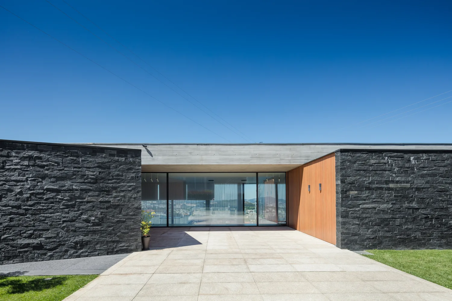 Os materiais foram escolhidos tendo em consideração a baixa manutenção e elevada durabilidade. A base volumétrica é o betão aparente, cofrado com ripas horizontais de madeira, em contraste com os tons de madeira, usada como negativo do volume bruto de betão.