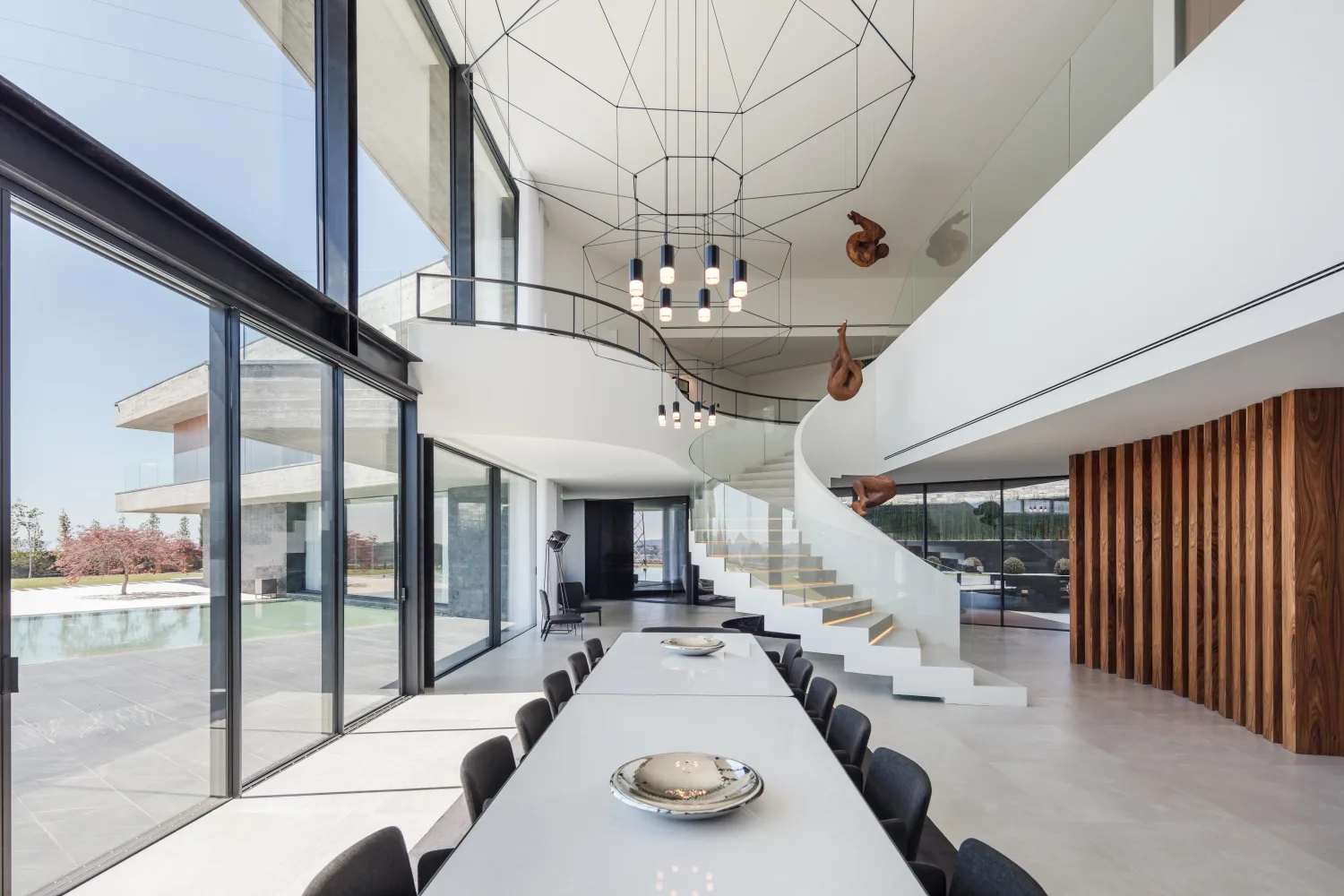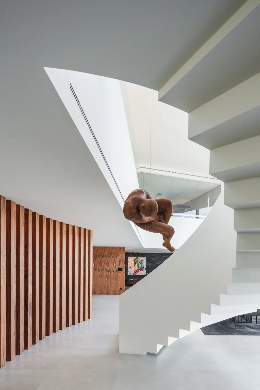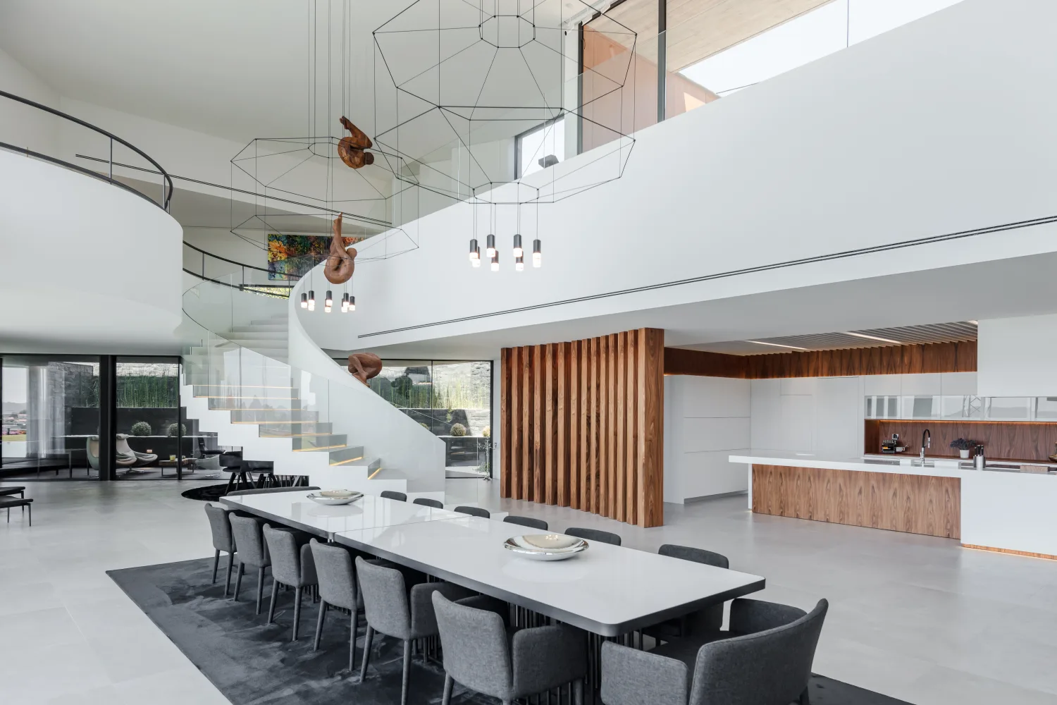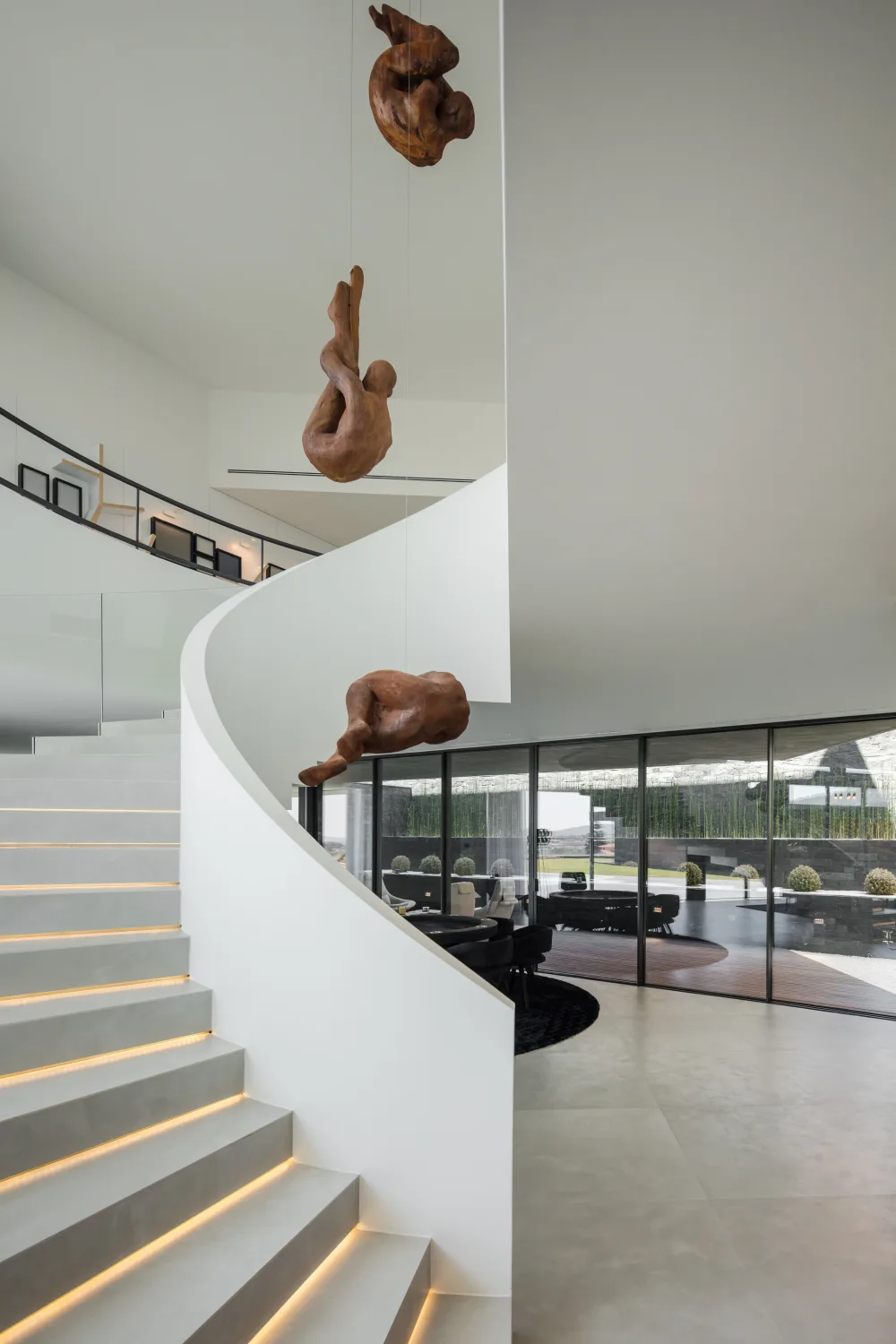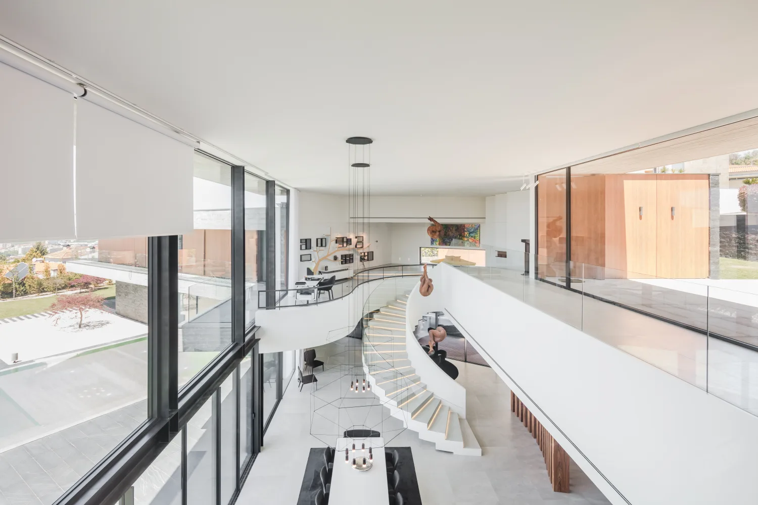 Um ponto de destaque no interior da casa é a escada cénica, em forma de meia lua, que une os dois pisos.
