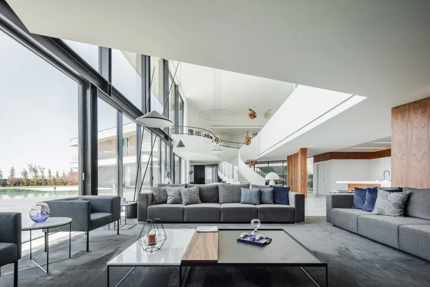 A garagem foi pensada para acolher alguns dos carros da vasta coleção do cliente. Este espaço é envidraçado para o interior da área social da habitação, criando uma área de exposição.