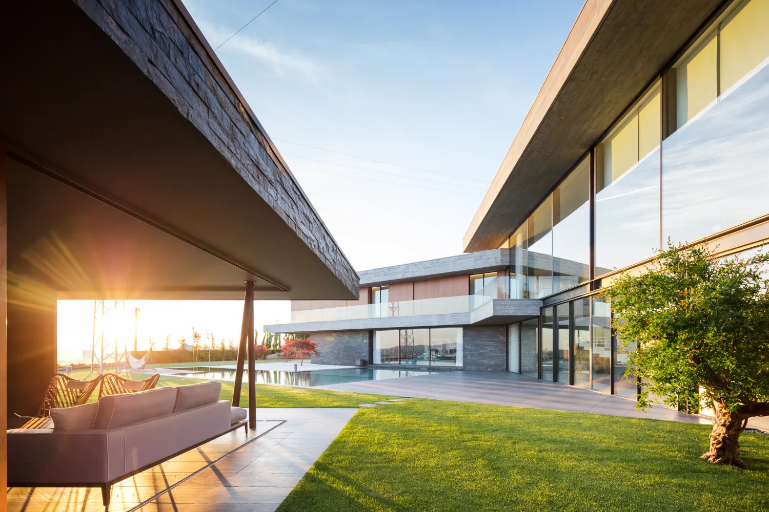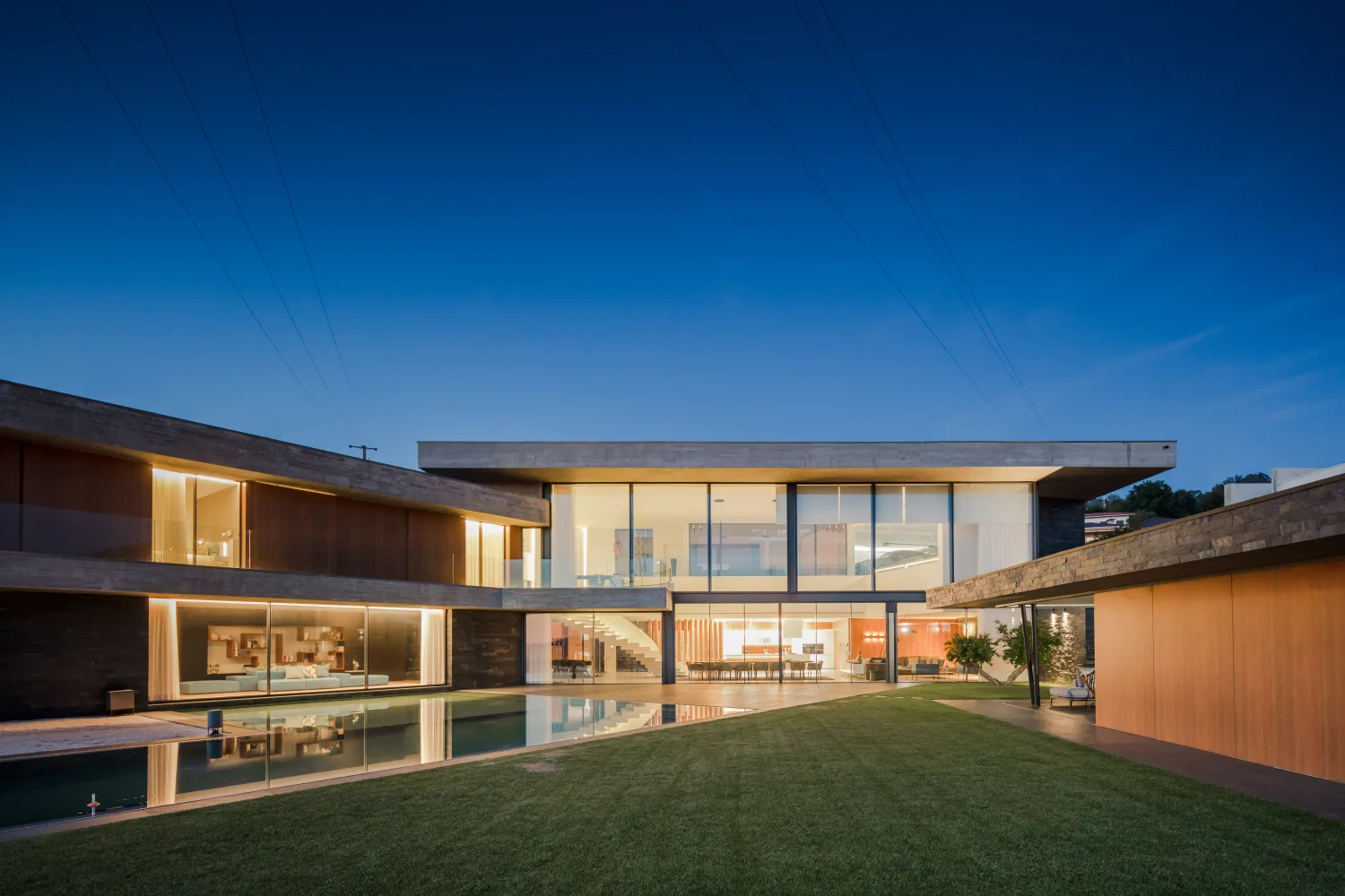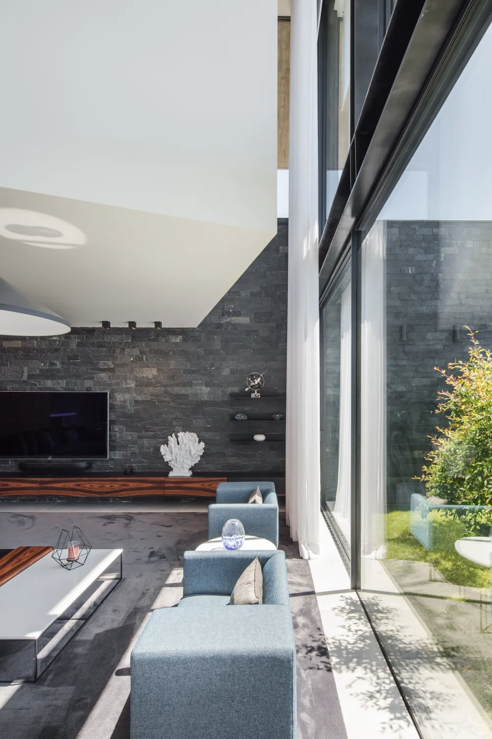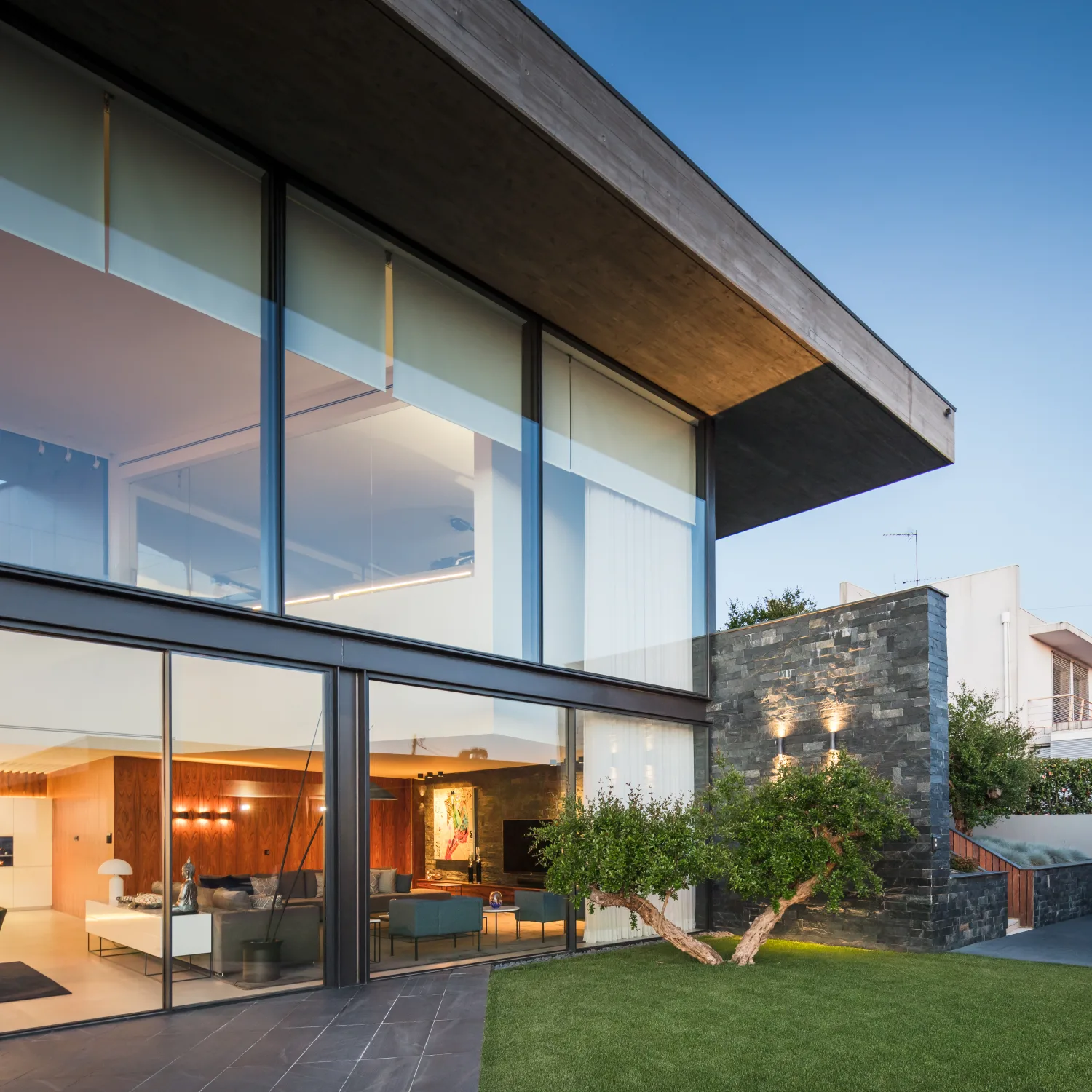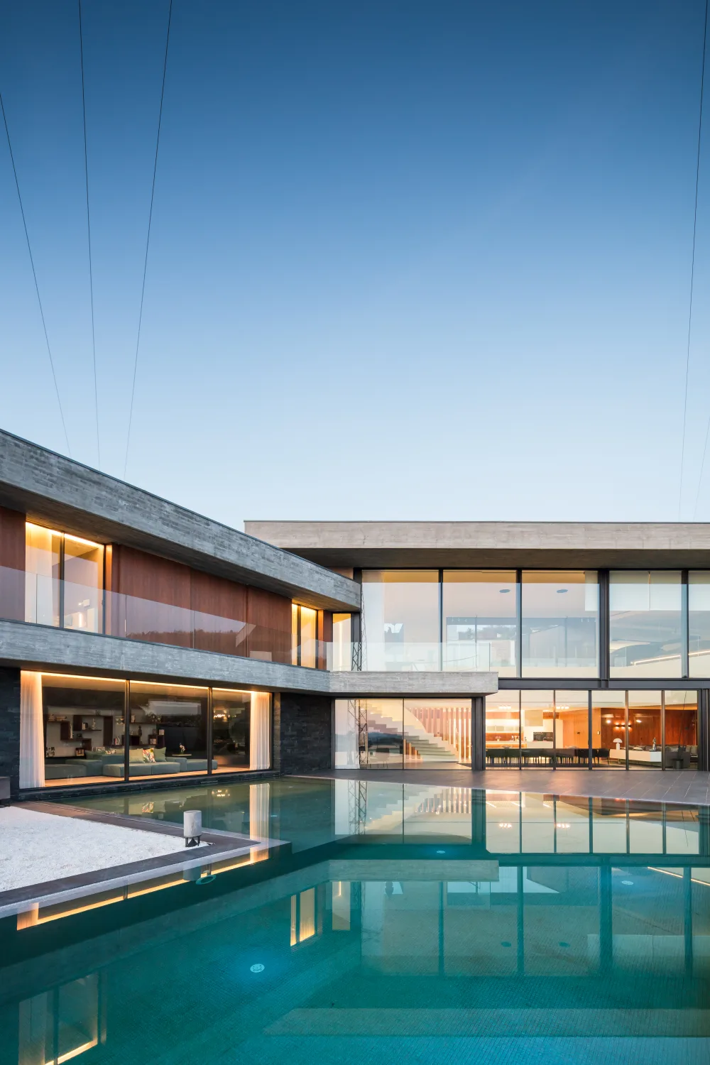 A habitação encontra-se num terreno com declive pelo que o piso de entrada se encontra ao nível da rua, havendo um piso inferior onde a sala se relaciona com o jardim e a piscina.